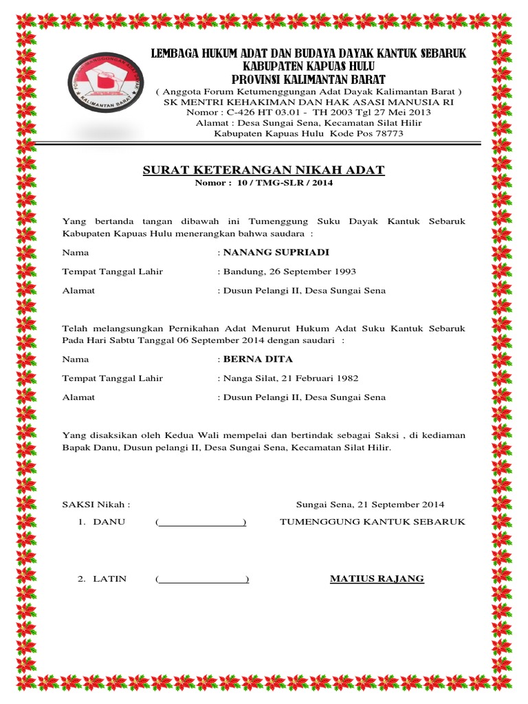 Mengurus Surat Nikah from cdn.statically.io Baca dan download kumpulan contoh surat pernyataan nikah siri, akta nikah siri dan contoh surat keterangan menikah siri dalam bentuk docx. Kekuatan supranatural dayak kalimantan banyak jenisnya, contohnya manajah antang. Manajah antang merupakan cara suku dayak untuk mencari petunjuk seperti mencari keberadaan musuh yang sulit di temukan dari arwah para leluhur dengan media burung antang, dimanapun musuh yang di cari. Selain tarian, provinsi kalimantan barat juga mempunyai kekayaan adat dan budaya lainnya, yaitu rumah adat kalimantan barat. Kustin itu sendiri berasal dari bahasa kutai yang artinya busana. Jenis rumah adat yang terkenal di kalimantan barat adalah rumah panjang atau biasa disebut rumah radakng. Di kalimantan barat sendiri banyak suku dayak dan setiap suku dayak yang ada di kalbar memiliki adat istiadat yang berbeda beda. Informasi tentang pakaian adat dayak kalimantan tengah, kalimantan barat, kalimantan timur dan kalimantan selatan beserta gambar merupakan sajian budaya indonesia kepada pembaca.